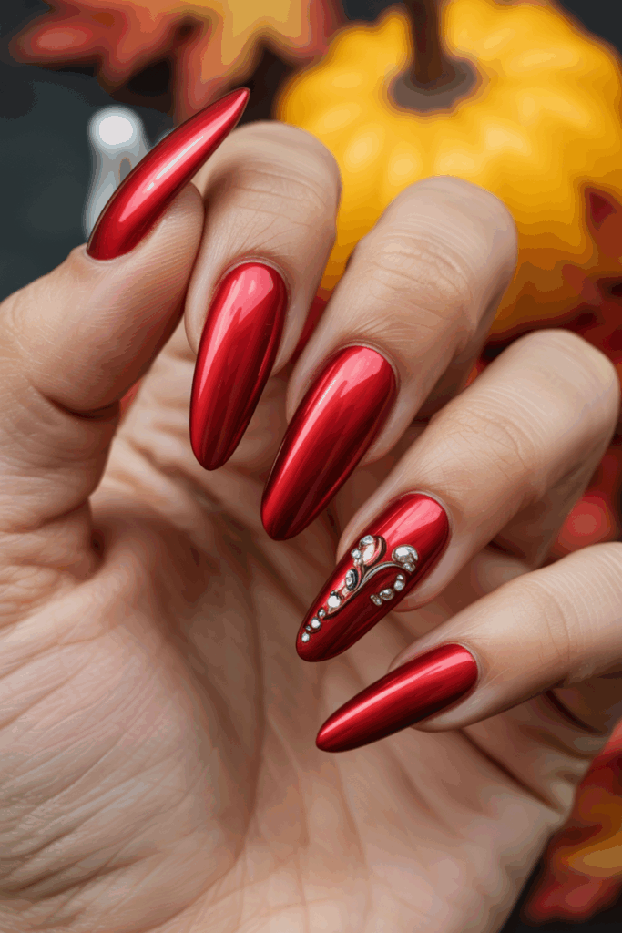 Bold acrylic red chrome nails offer a strong, shiny look perfect for fall. The deep red color combined with a reflective chrome finish adds richness and depth.
