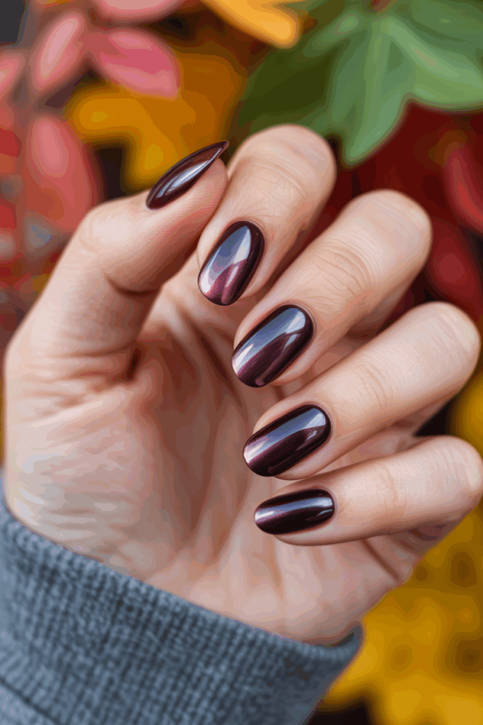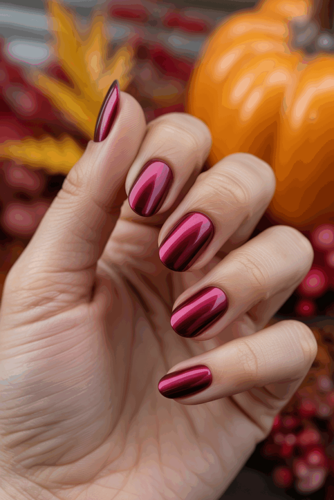 Deep burgundy chrome nails are a stunning choice for fall. This rich color brings warmth and sophistication to your look. The shiny chrome finish adds a modern twist, making your nails pop.