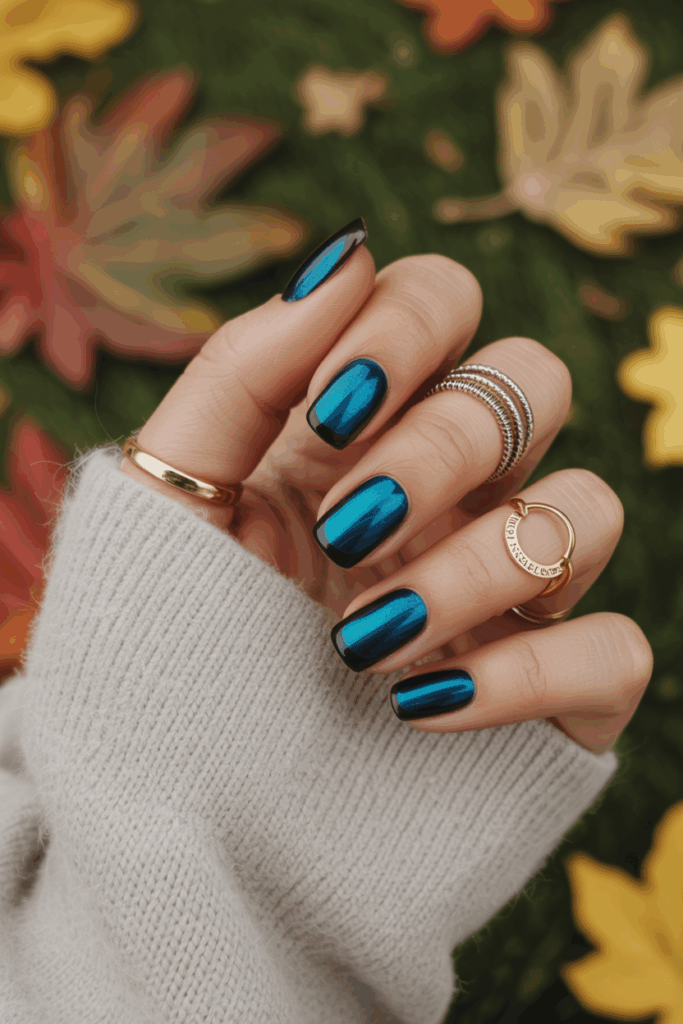 This nail design combines a stunning peacock blue chrome finish with chic matte black tips. The contrast between the shiny blue and the sleek black creates a striking look that’s perfect for fall.