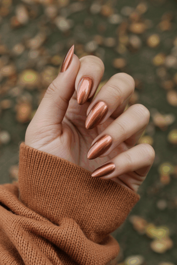 Copper chrome nails with an almond shape offer a warm, metallic look perfect for fall. The almond shape elongates the fingers, creating an elegant appearance. This style pairs well with deep autumn shades and minimalist accents, making it both stylish and seasonal.