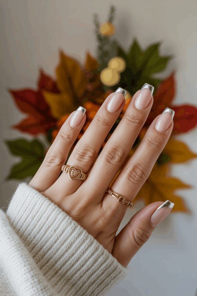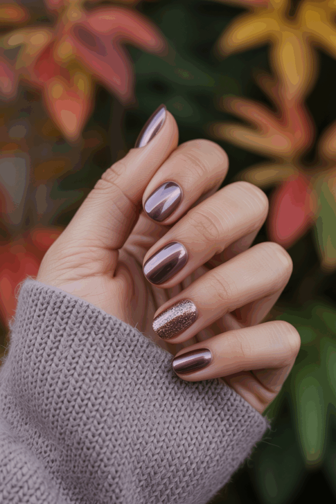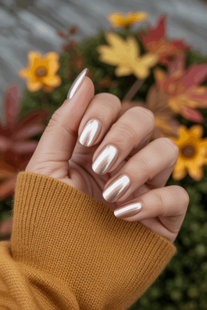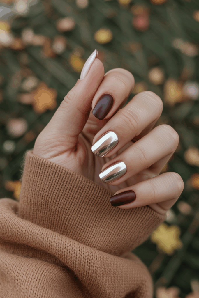 This combination looks especially stylish when paired with earthy autumn tones like olive, taupe, or burgundy. You can even use chrome just on accent nails or tips for a subtle touch of glam.
