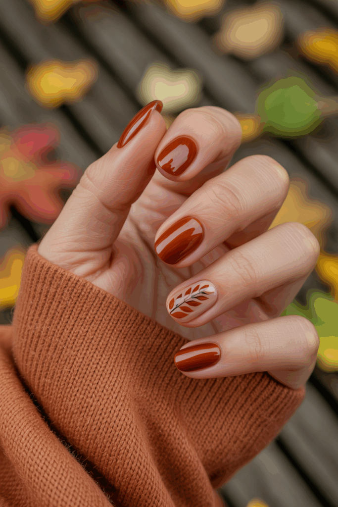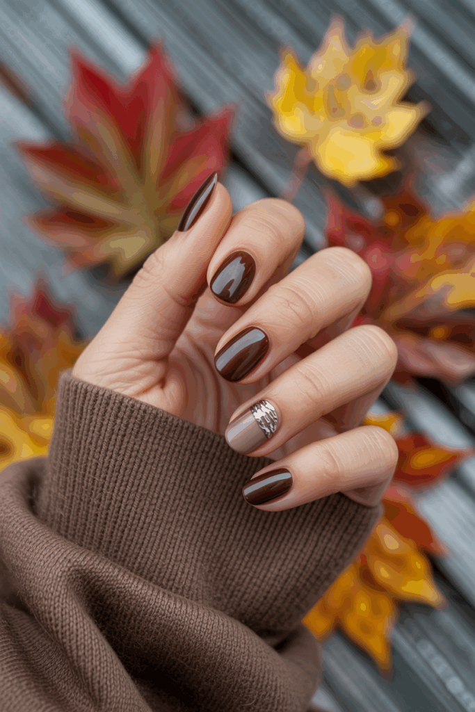 Chocolate brown nails are a timeless choice, especially in the fall. This rich hue brings warmth and sophistication to any look. The nails in the image showcase a glossy chocolate brown base that perfectly complements the vibrant autumn backdrop.