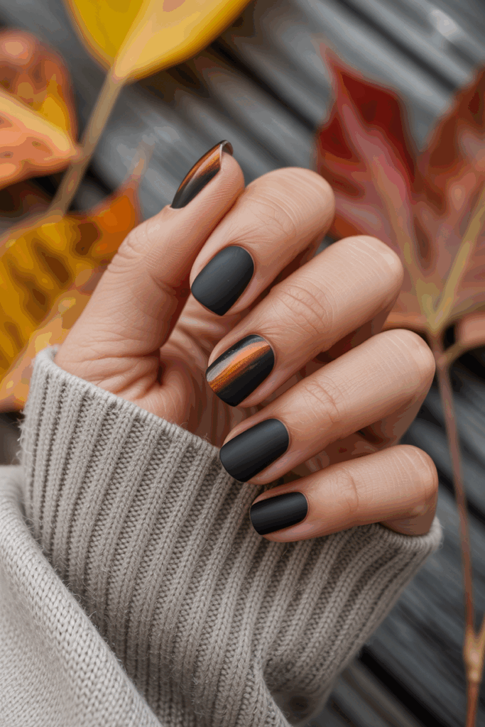 This nail design is a perfect blend of bold and chic. The matte black base gives a sleek and modern look, while the shimmering copper tips add a touch of warmth and sparkle. It’s a style that effortlessly transitions from day to night, making it versatile for any occasion.