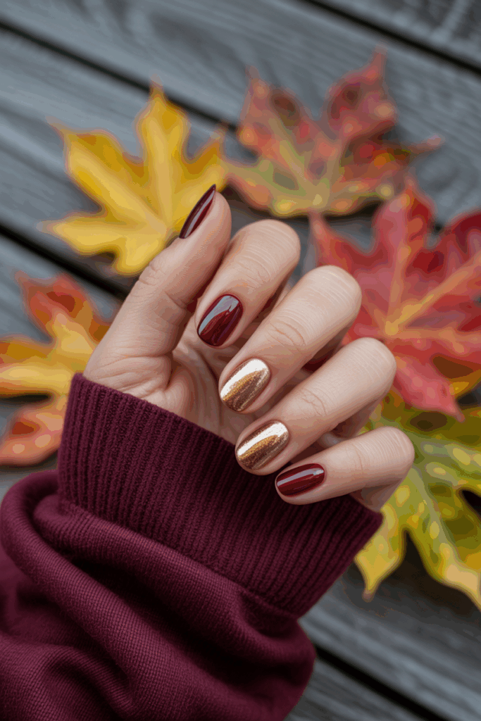 Pair this look with burgundy lips or cozy knitwear for a cohesive autumn vibe. For extra glam, add gold foil or glitter details to enhance the reflective finish.