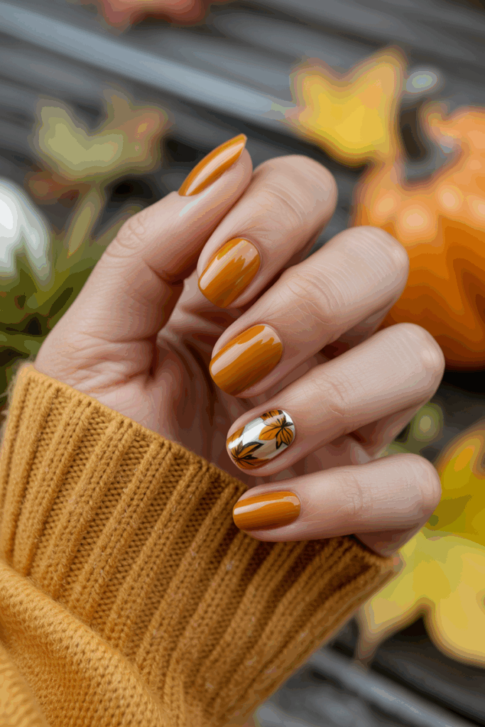 Accessorizing with a simple leaf-shaped ring enhances the theme, making your look even more cohesive. This design is perfect for anyone looking to embrace the fall vibes while keeping it stylish and chic.