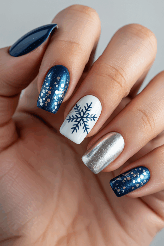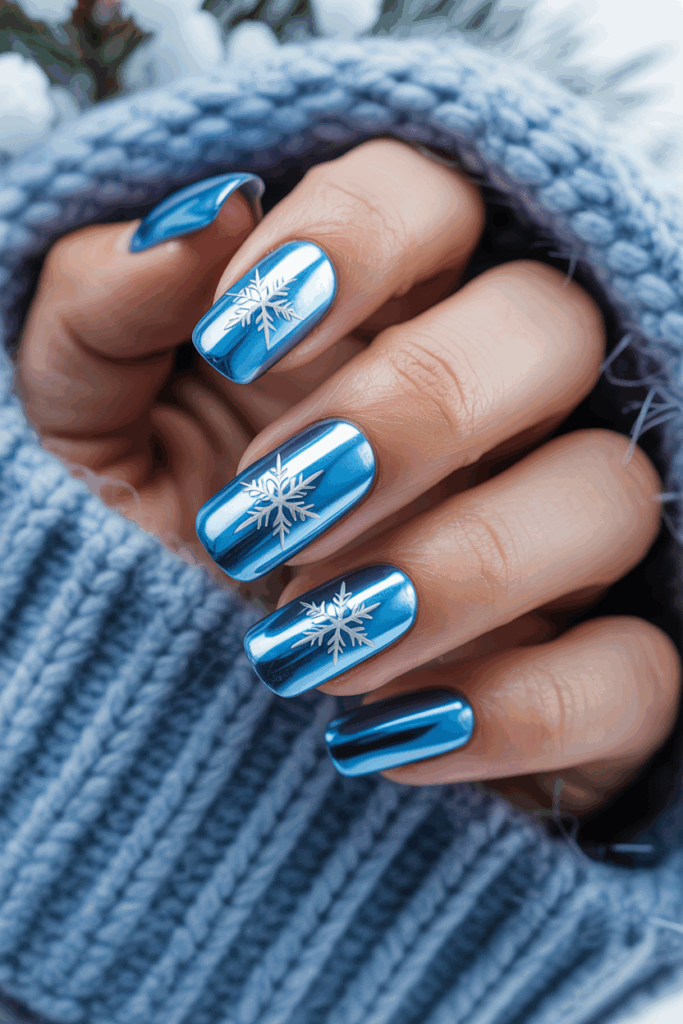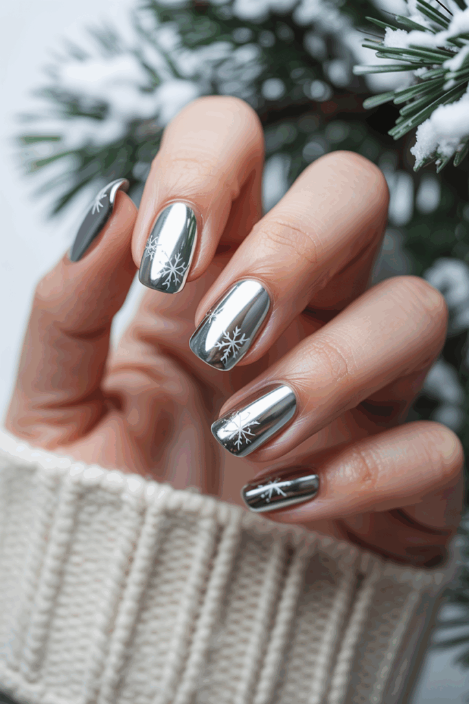 It works well on short or almond-shaped nails. These tiny snowflakes add a subtle winter touch without overwhelming the chrome finish.