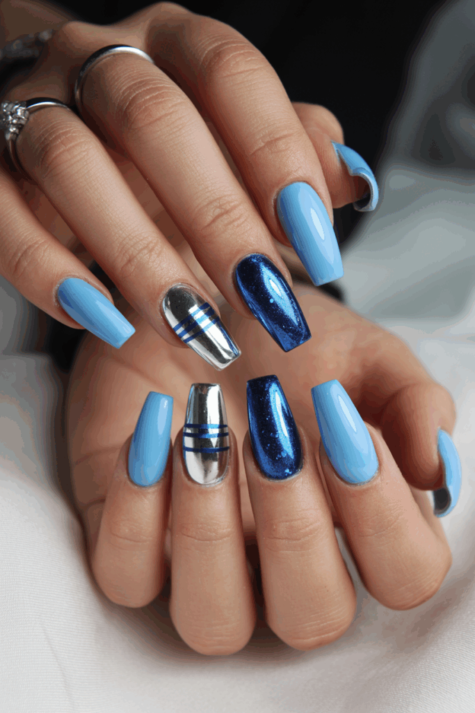 Icy blue highlights can be added as tips or small designs. This adds brightness without overpowering the chrome effect.