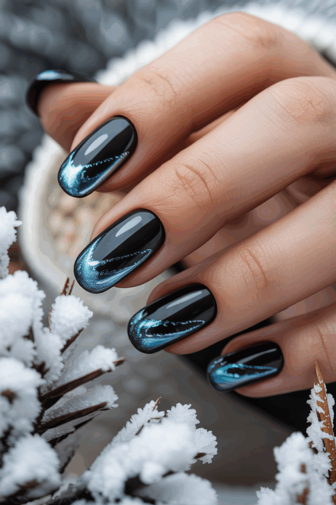 Black chrome nails offer a sleek and modern base that pairs well with icy blue accents. The contrast between dark and cool tones creates a sharp, winter-inspired look.