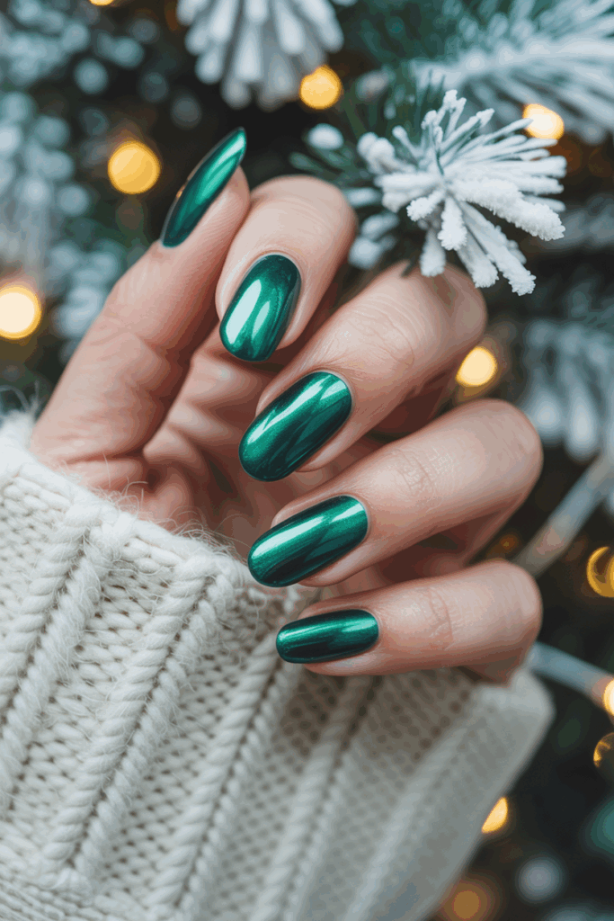 Emerald chrome nails offer a rich and striking look perfect for the holiday season. The deep green shade shines with a reflective chrome finish, adding a touch of luxury and sophistication.
