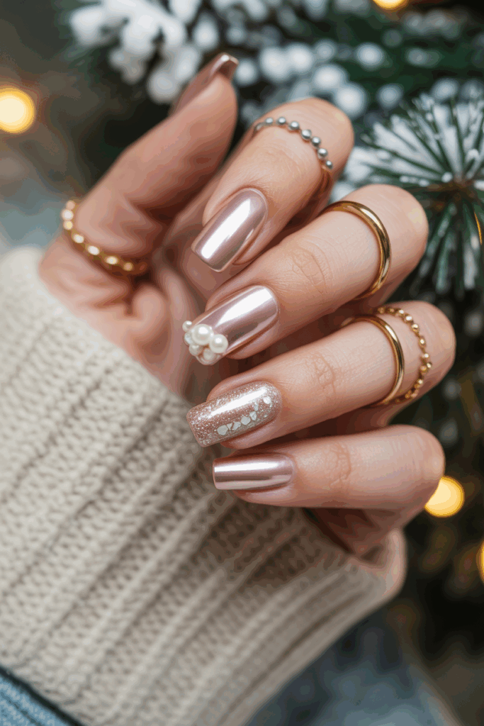 Champagne chrome with pearls offers a classy, modern look for winter. It balances simplicity with a unique detail that stands out quietly.