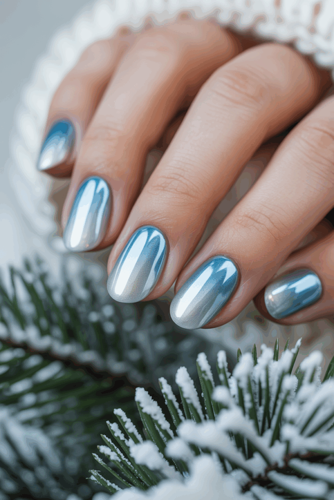 This chrome nail style blends light blue and white for a smooth gradient effect. It captures a cool, wintry feel without being overwhelming.
