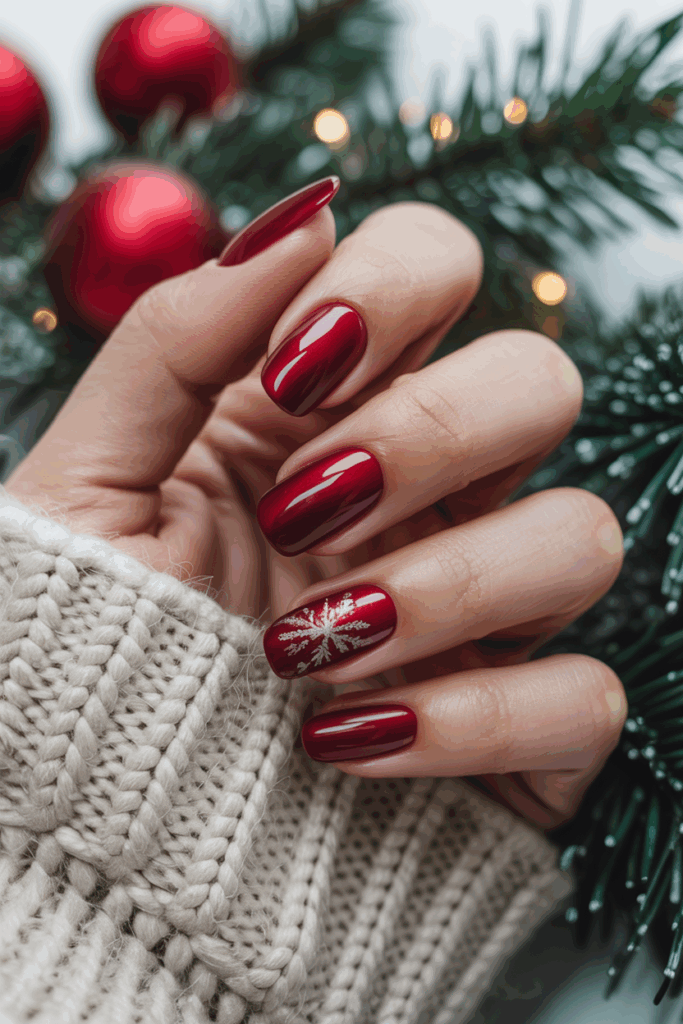 The deep red tone gives nails a classic yet bold feel. It balances elegance and brightness for a stylish winter manicure.