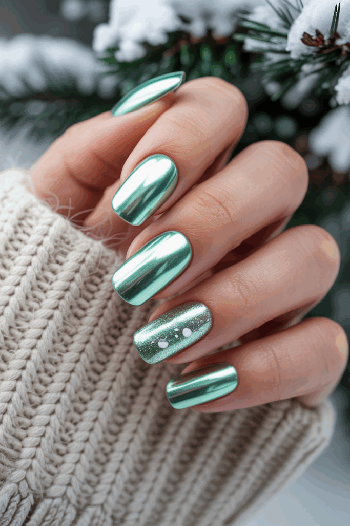 Mint green chrome nails offer a clean, fresh style perfect for winter. The soft green shade adds a subtle pop of color without being too bold.