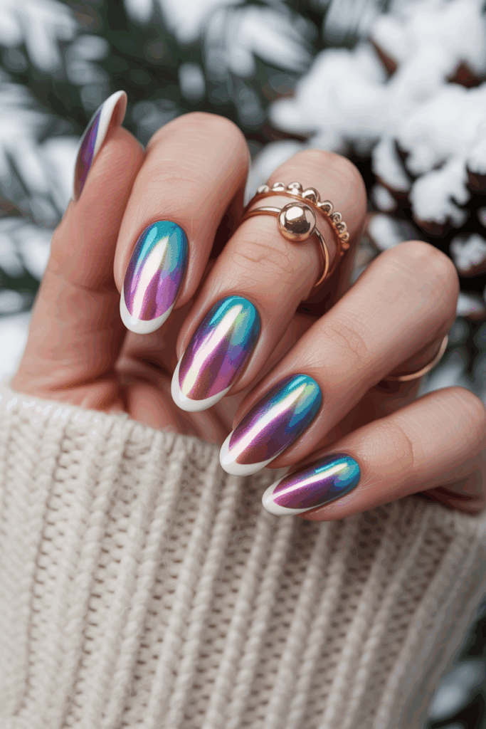 The almond shape adds subtle sophistication. It makes the iridescent chrome finish stand out more. This design is great for winter, offering a cool, fresh vibe.