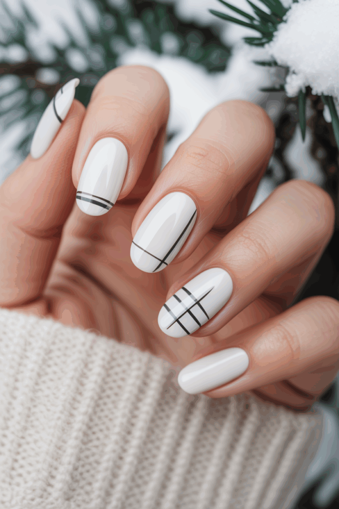 The simple lines create a sleek contrast, making the nails appear elegant and polished. This style suits those who prefer a subtle yet stylish winter manicure.