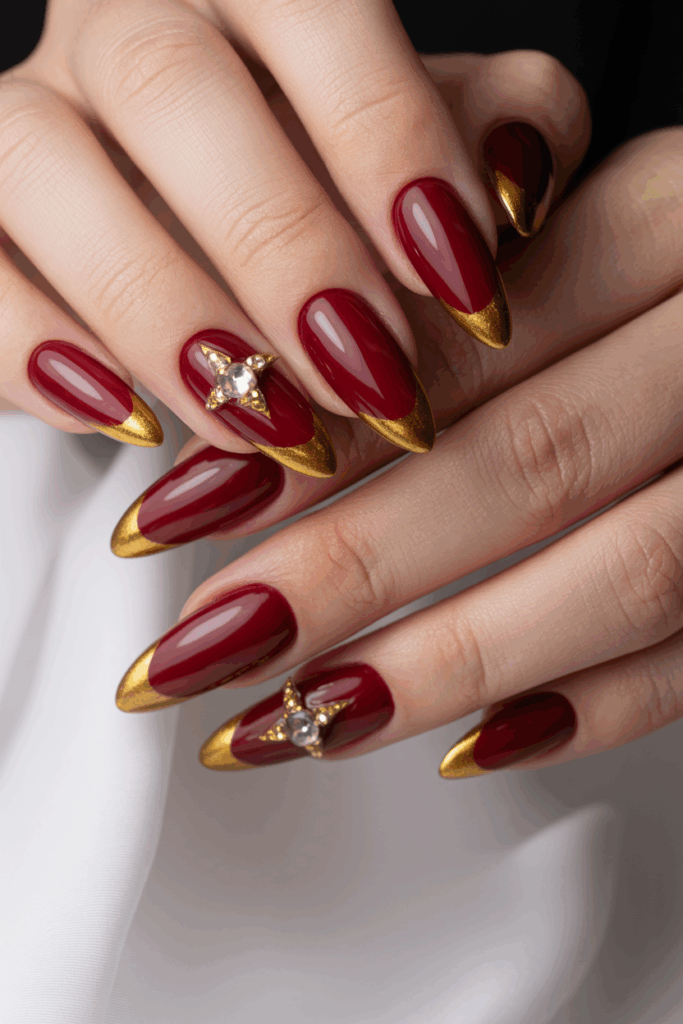 This look can be simple, with just a gold glitter tip or a small gold detail. For more texture, designs often include subtle patterns like snowflakes or metallic bows. The mix of matte burgundy and shiny gold creates a balanced, elegant style.