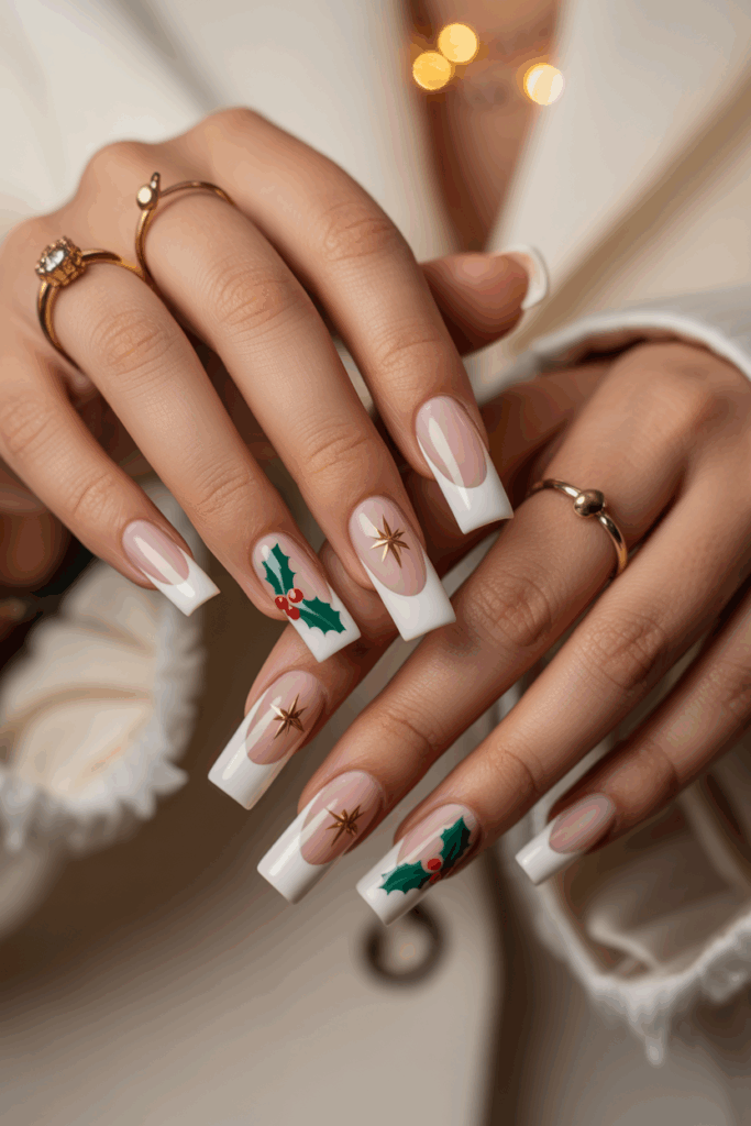 This nail style keeps the classic French manicure look but adds small festive details. The clean white tips stay, while subtle holiday elements like tiny snowflakes or simple red and green stripes appear.
