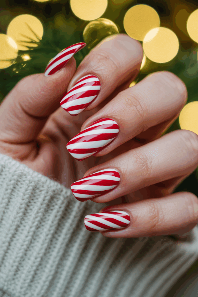 Candy cane stripes are a simple and classy way to celebrate Christmas on nails. The design uses red and white stripes, mimicking the look of a candy cane. This classic pattern fits well with many styles.