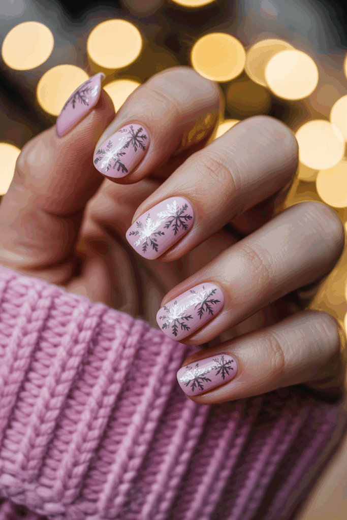 The silver snowflakes stand out against the light pink, giving the nails a festive but classy look. Small silver glitter or accents often highlight the snowflake patterns.