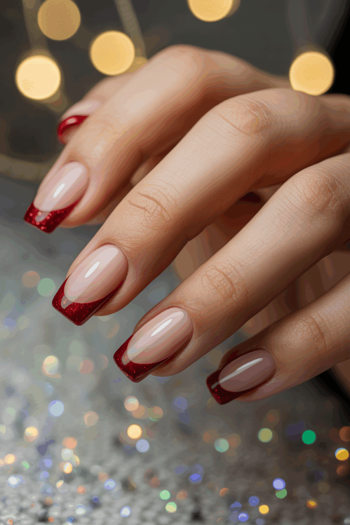 This design pairs a soft nude base with bright, sparkling red tips. The contrast between the neutral base and the festive red creates a refined, eye-catching look.