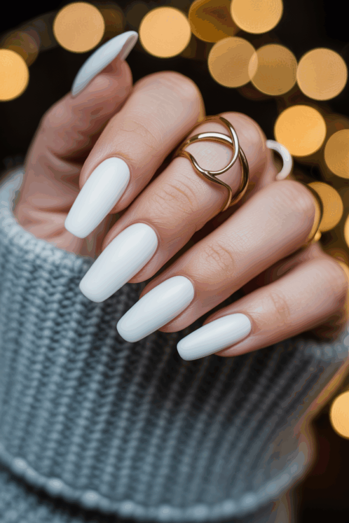 The winter white matte finish suits both short and long nails. Its versatility makes it a popular option for those who want a classy, timeless holiday manicure.
