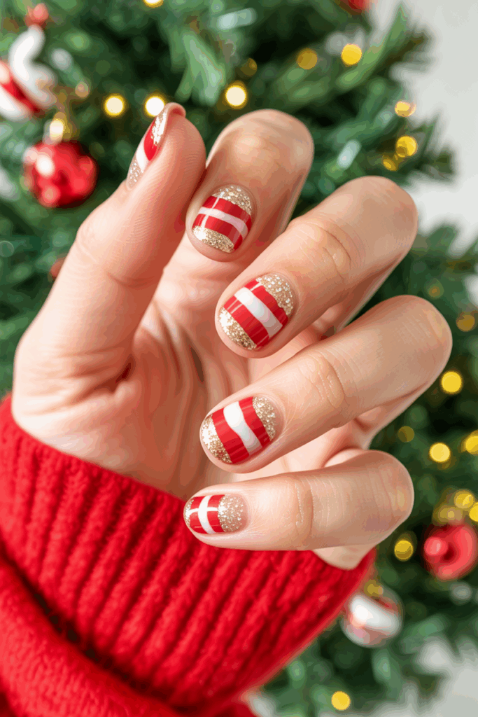 Glittery candy cane striped nails mix classic red and white stripes with a shiny sparkle. The glitter adds a festive touch without hiding the simple pattern.