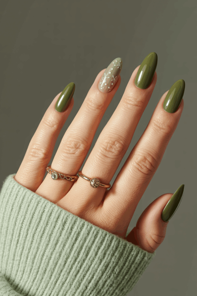 This nail style uses a soft olive green shade to create a calm, cozy look. The muted tone feels warm and subtle for the holiday season.
