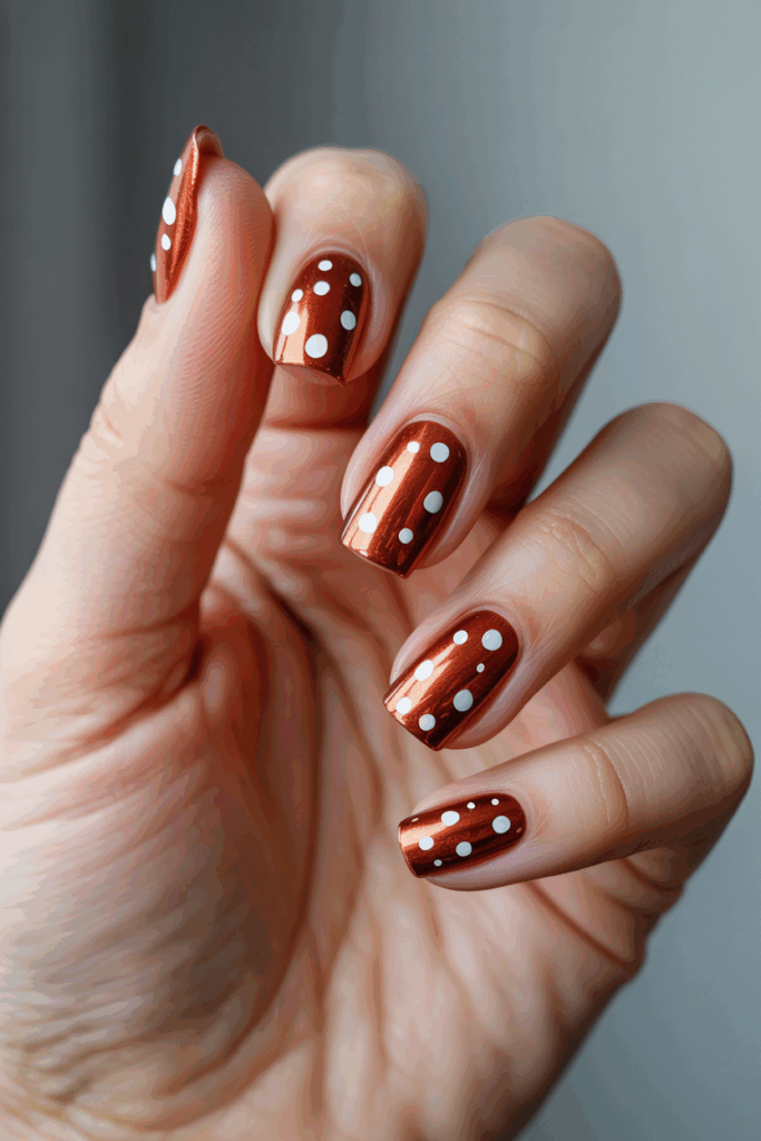 This design features a rich copper polish that adds warmth to the nails. Small, simple dots break the solid color without overwhelming the look.