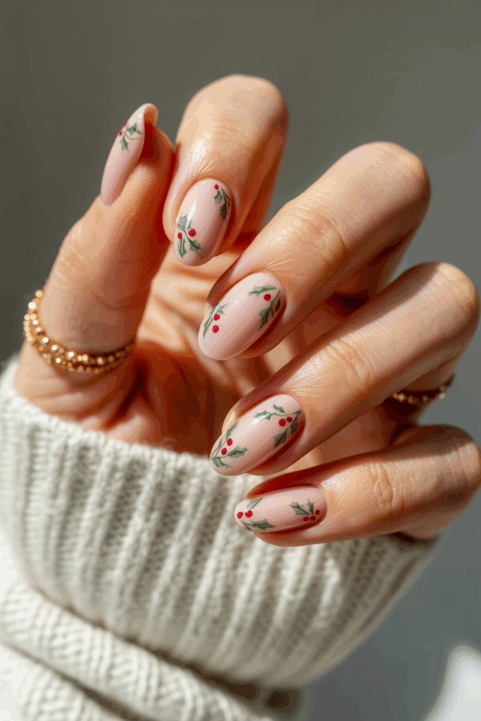 This design uses a soft pink base for a gentle, cozy look. Small holly berries and green leaves are painted on one or two nails for a festive touch. It’s a simple and elegant way to add holiday spirit without being too bold.