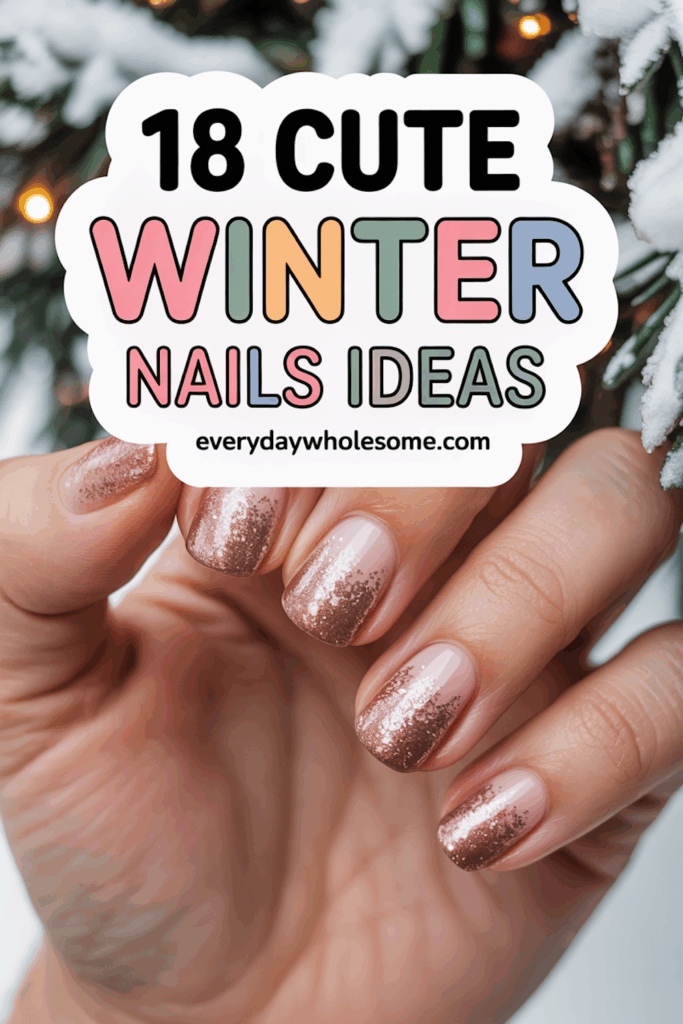 Sparkly rose gold ombré nails blend soft pink tones with shimmering glitter. This style adds a gentle glow that fits well with winter’s cool colors.