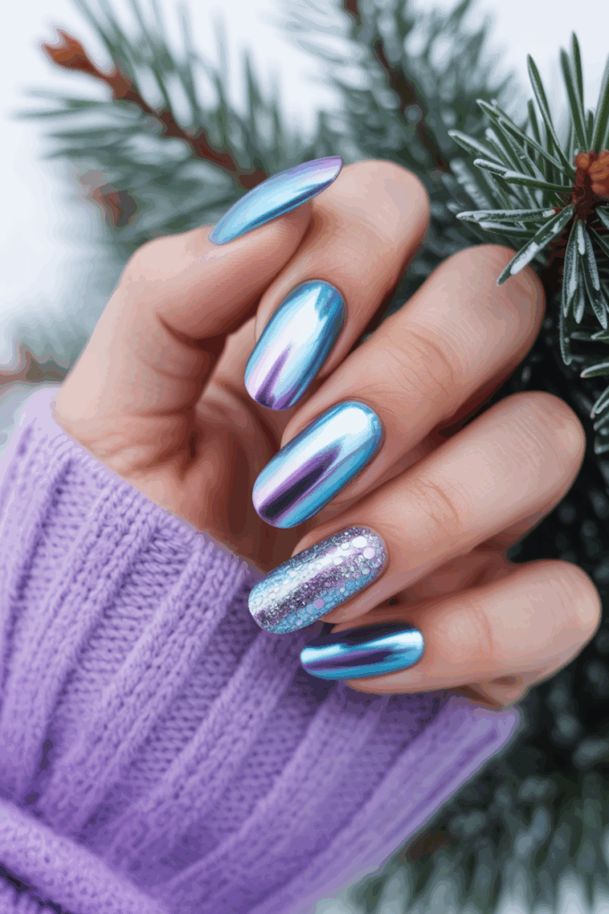 Bold chrome nails in icy colors create a sharp, modern look for winter. Shades like silver, icy blue, and frosty white bring a cool shine to nails. This style adds a sleek, metallic finish that fits well with both casual and formal winter outfits.