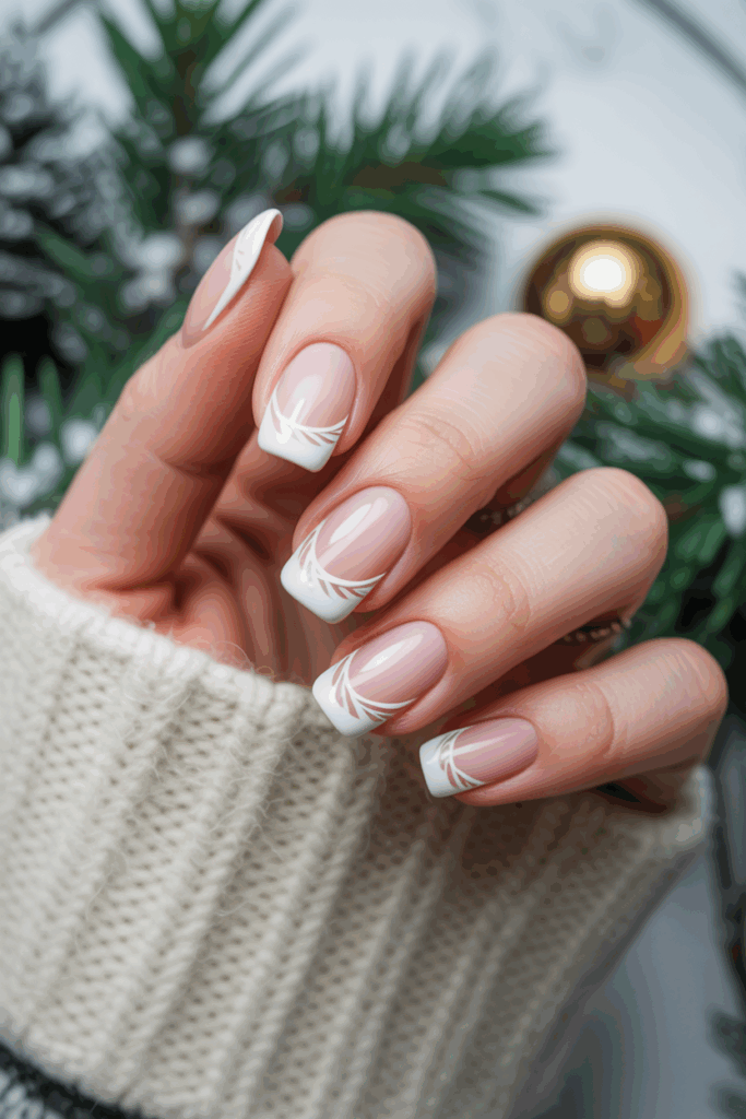 This style keeps the clean white tips of a classic French manicure. It adds a winter touch with frosty shimmer or subtle glitter.