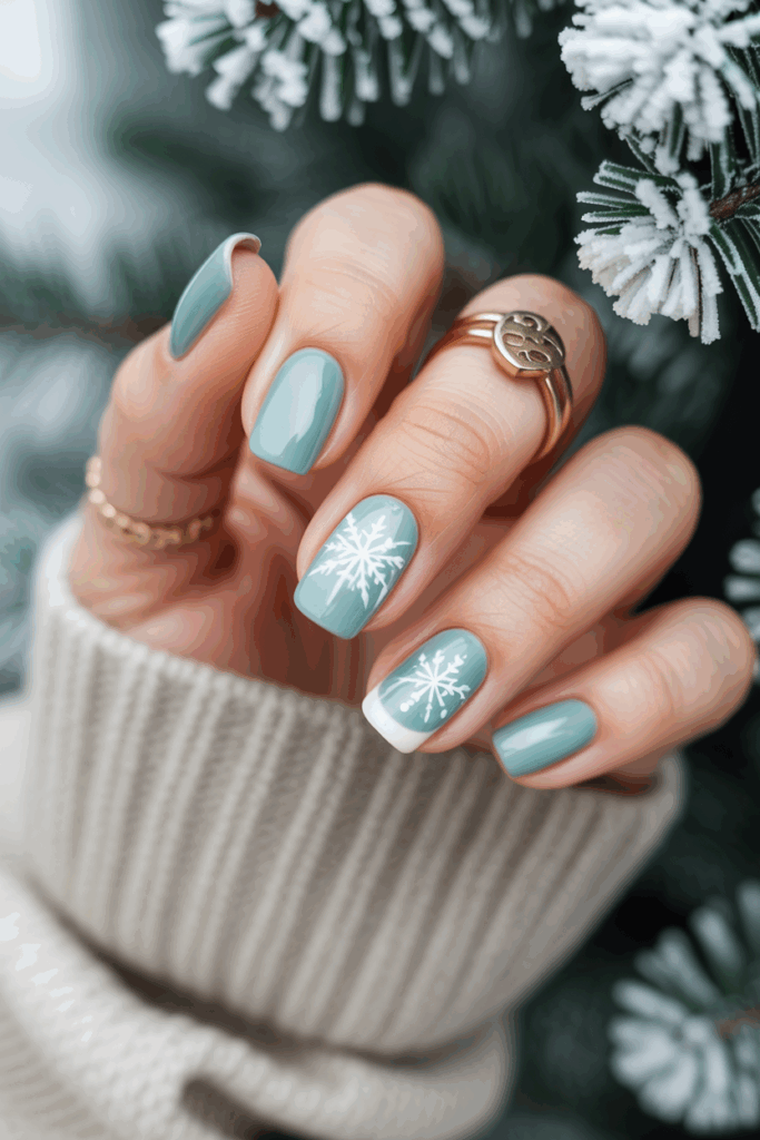 This design features a soft mint base, perfect for a cool winter look. White accents add a fresh, clean contrast without being too bold. The style stays simple but feels elegant and seasonal. It works well for both casual and dressy occasions.