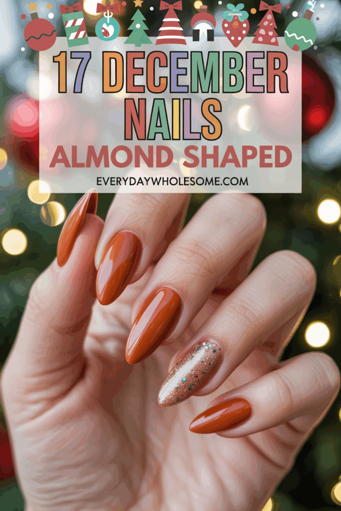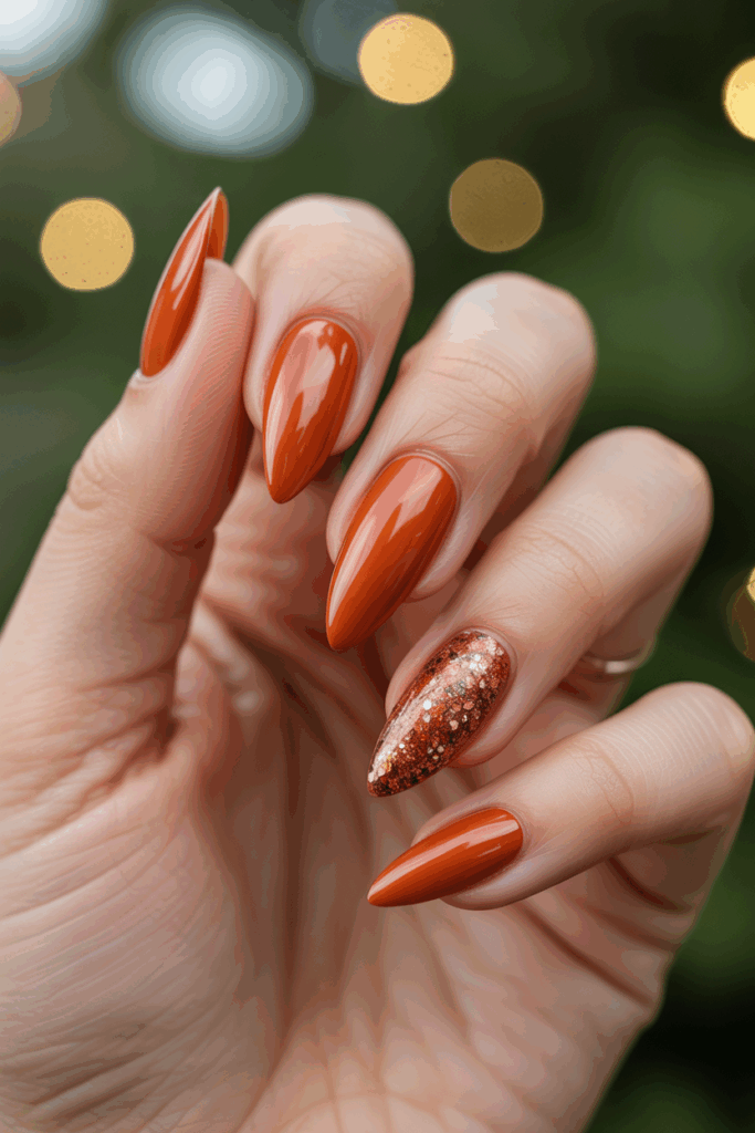 Rust orange almond nails offer a warm and earthy look perfect for December. The subtle glitter adds a touch of sparkle without being too bold. This style balances elegance and seasonal charm, making it suitable for both casual and festive settings.