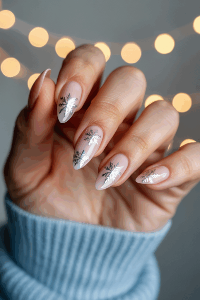 These nails use a soft silver base with delicate snowflake decals. The silver adds a cool, wintery feel that suits the almond shape well.