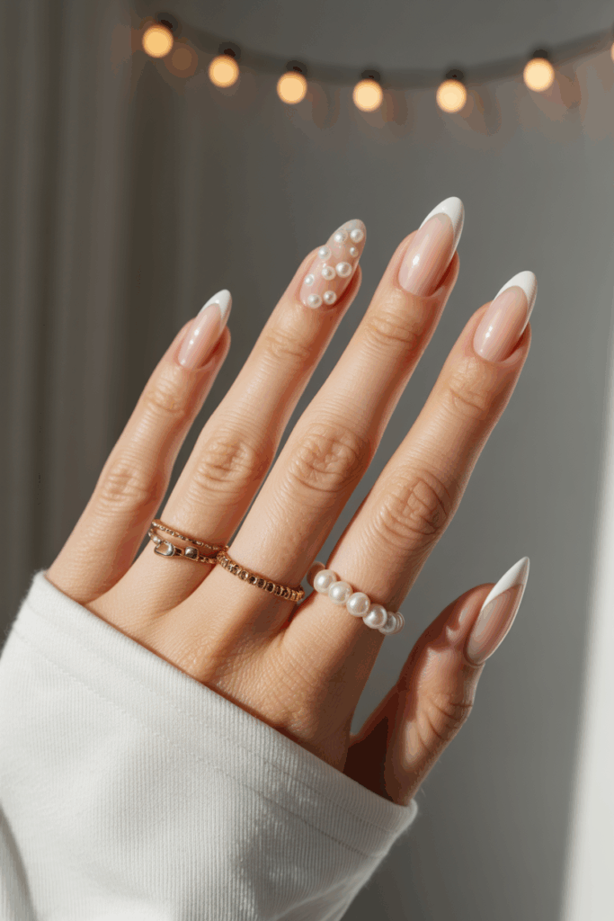 9) Almond nails with pearl accents