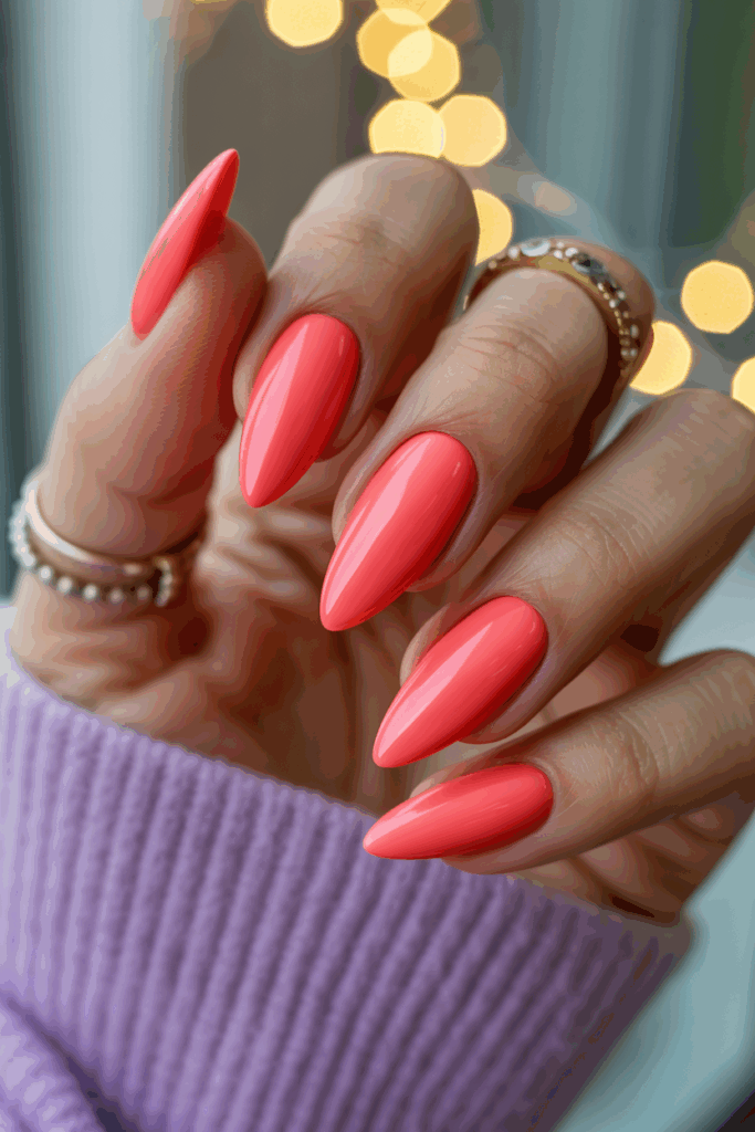 8) Bright coral almond nails for winter warmth