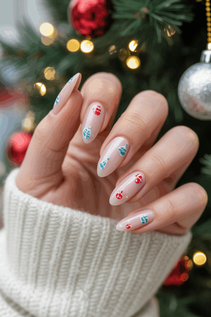 They feature small, delicate ornament designs on almond-shaped nails. These nails add a festive touch without being too bold. The tiny details create a neat, elegant look perfect for the holiday season.