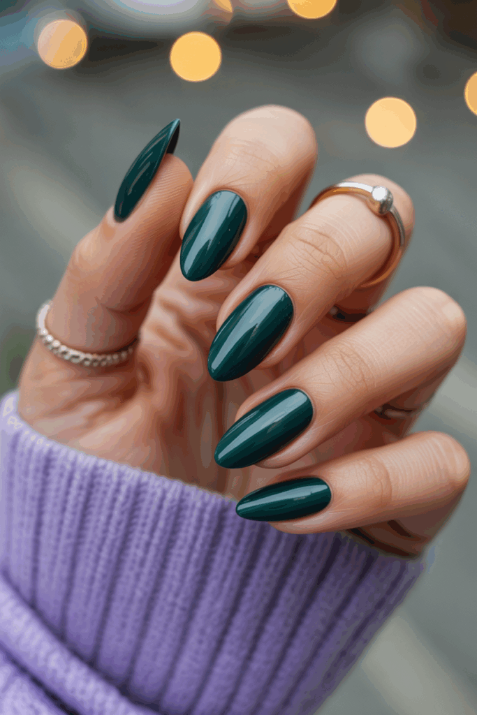 Deep emerald green almond nails offer a rich, elegant look. The color works well with shiny or matte finishes. This style suits both casual and formal occasions. It balances boldness with sophistication, making it a popular choice for winter nails.