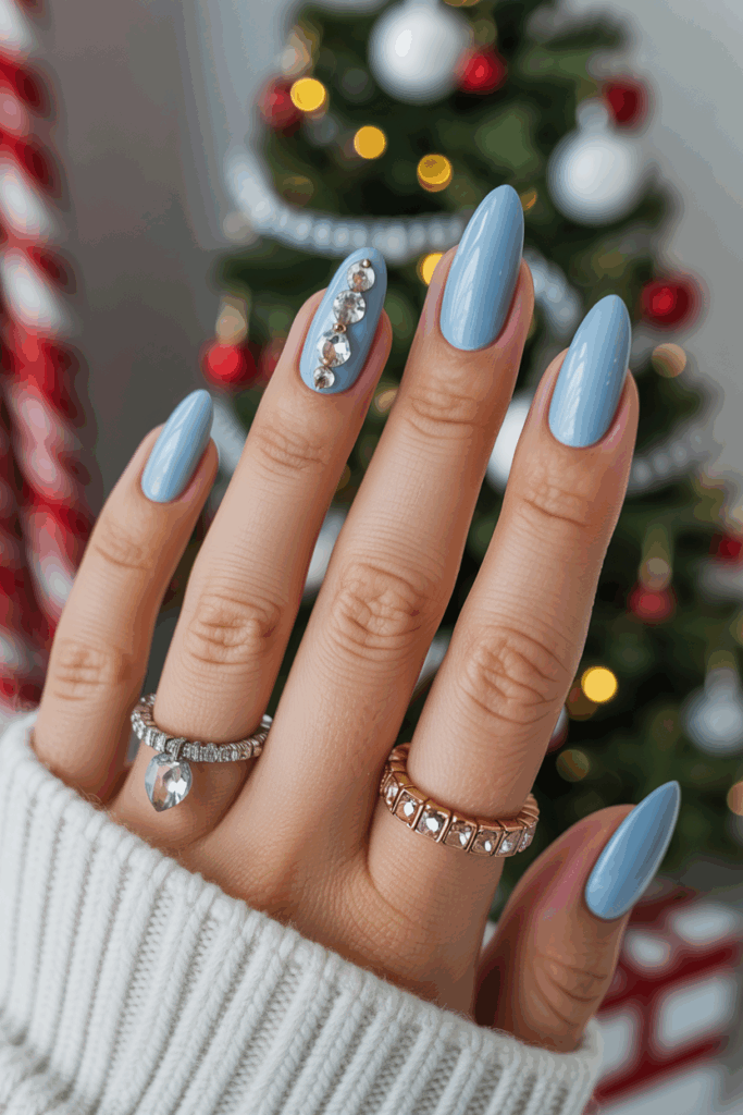 Icy blue almond nails create a cool, elegant look for December. Rhinestones add a touch of sparkle without being too flashy. This style works well for both everyday wear and special occasions. The combination highlights the almond shape while keeping the design simple and stylish.