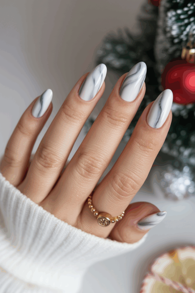 Marble effect nails use swirls of grey and white to create a natural stone look. The almond shape enhances the elegance of this design. It suits both casual and formal occasions in December. The mix of colors adds depth without being too bold.