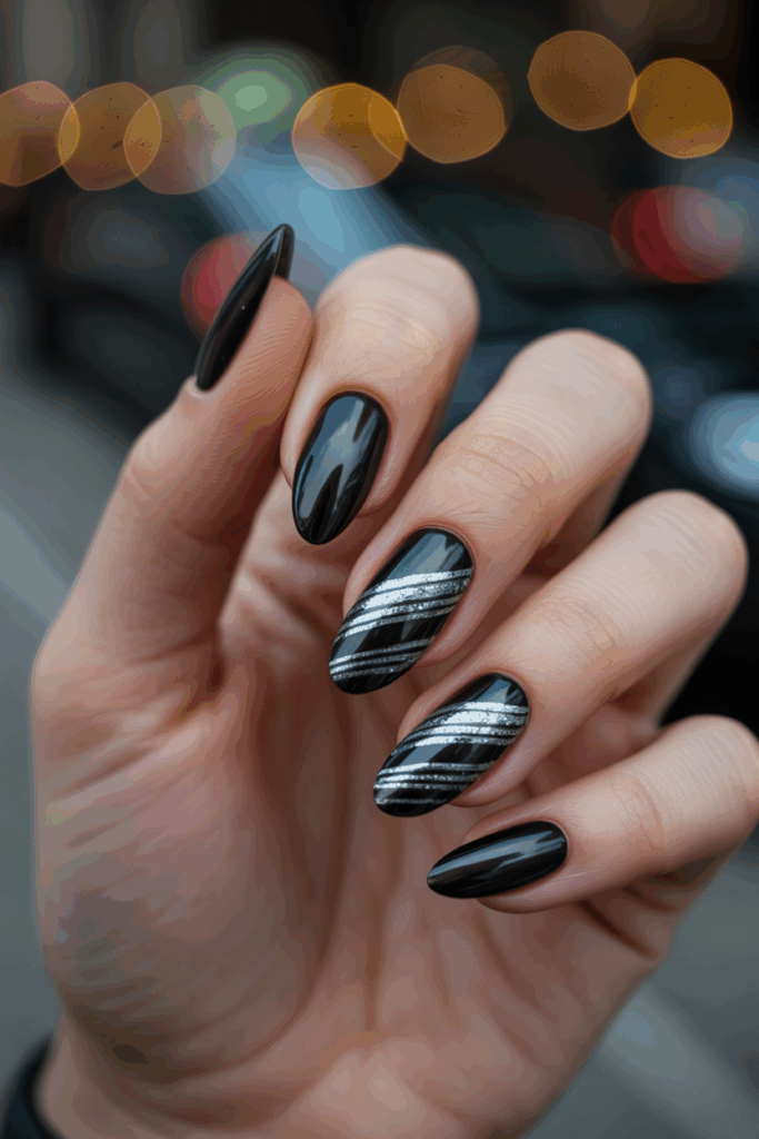 7) Sleek black almond nails with silver stripes