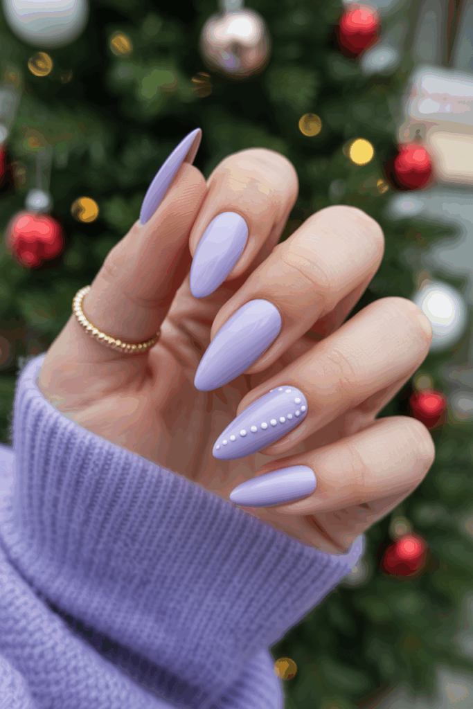 These nails feature a soft lavender base that looks calm and stylish. Small, delicate dots add a subtle detail without overwhelming the nails. This design suits those who want a gentle, simple look with a touch of elegance for December.