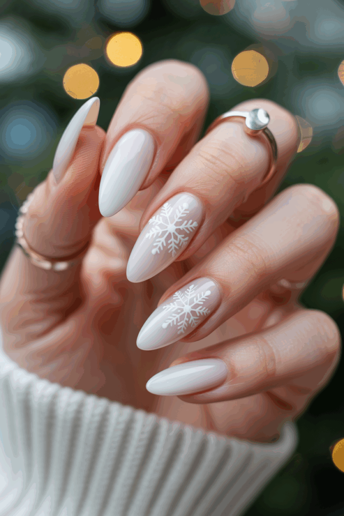 White almond nails offer a clean and elegant look. Snowflake designs add a festive, winter touch.