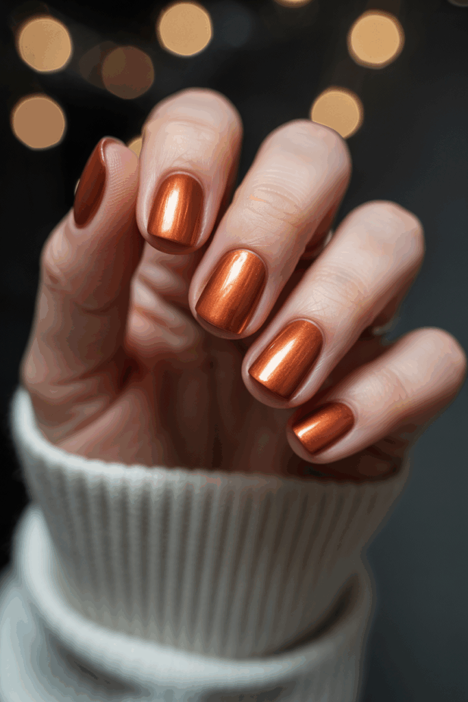This style works well with simple designs like fine copper lines or accent nails. It pairs nicely with neutral tones for a cozy, stylish effect.
