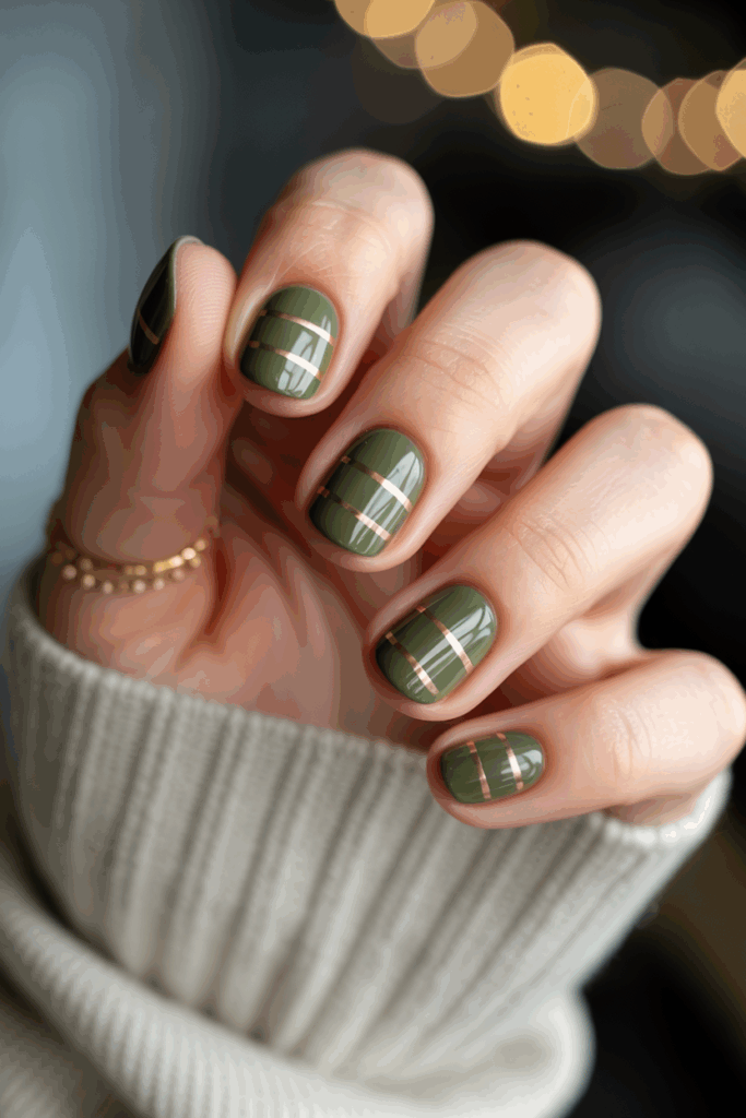 This nail design pairs olive green with thin metallic stripes for a clean, modern look. The stripes add a sleek shine that contrasts well with the muted green. It works well for those who want a simple yet stylish manicure with a touch of elegance.