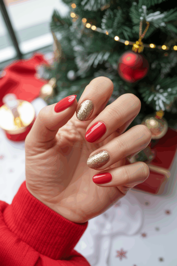 This nail design pairs deep red polish with a single gold glitter accent. It offers a simple yet elegant look suited for holiday events. The gold glitter adds just enough sparkle without being too flashy. This style works well for those wanting festive nails with a classic touch.