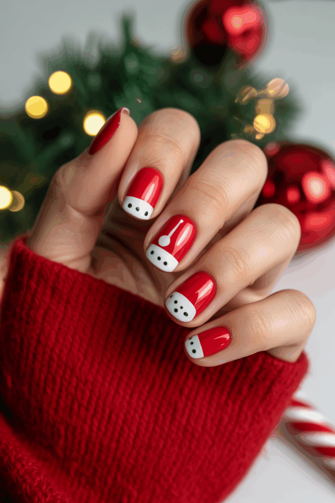 This design uses a red base coat to highlight the classic look of Santa hats. White tips or small white dots create the hat’s furry trim and pom-pom. It is simple yet festive, making it easy to wear for the holiday season.