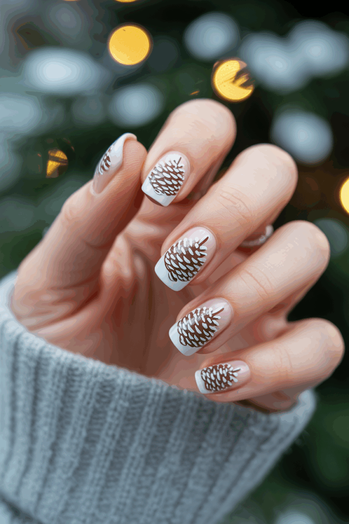 Snow-covered pinecone nail designs use soft whites and earth tones to create a natural winter look.