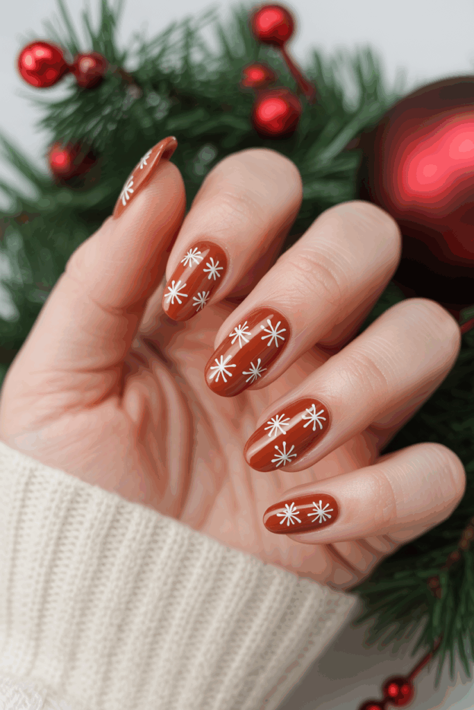 This design features a warm terracotta base color that contrasts well with crisp white snowflakes. The white snowflakes add a winter touch without being too bright. It works nicely for those who want a cozy, seasonal look with a bit of elegance.